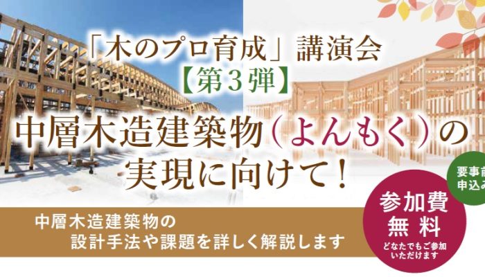 今回の講演会[第3弾]では、中層木造建築物(よんもく)の実現に向けて設計手法や課題について、専門家より詳しくご解説いただきます。